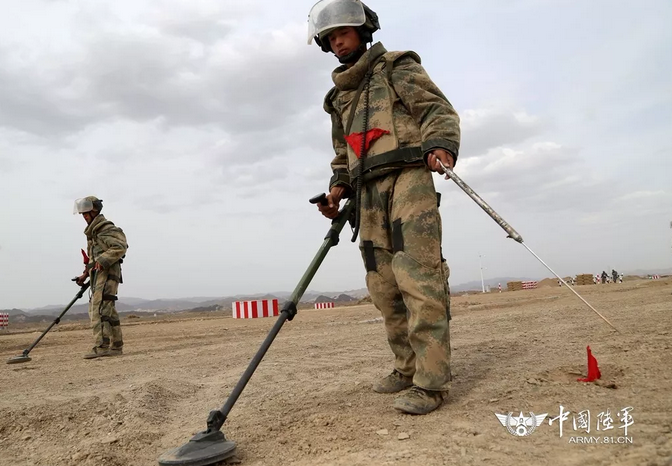 淺灘偵察,接到指令后,裝甲運(yùn)輸車快速?zèng)_擊至淺灘障礙前,工兵班組魚(yú)貫而出,排雷手身著20公斤的搜爆服在濁水進(jìn)行排雷作業(yè),水柱騰空而起,防坦克地雷被成功起爆。沖出險(xiǎn)灘后,一片高密度、多型號(hào)的雷場(chǎng)封鎖了裝甲車前進(jìn)的道路,兩名投錨手將半發(fā)雷引爆后,探雷手立即手持探雷器,開(kāi)始了探雷作業(yè),為了使作業(yè)環(huán)境更加貼近實(shí)戰(zhàn),他們還在雷場(chǎng)中專門(mén)增加設(shè)置了鐵絲彈殼等金屬干擾物。