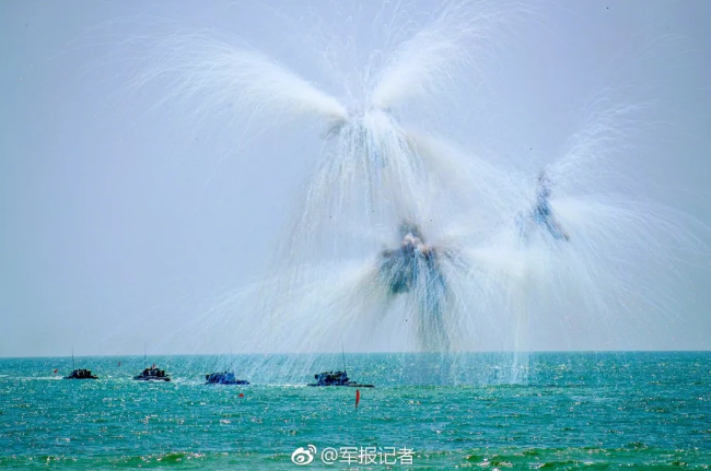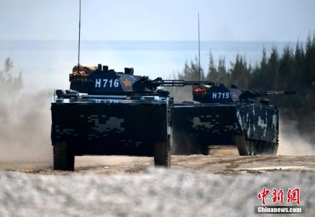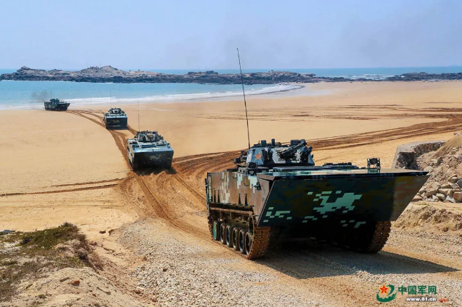 作戰(zhàn)課目演示中,兩棲裝甲車從海上發(fā)起沖擊,泛水抵灘后迅速鎖定目標,大口徑突擊炮、車載機槍連番開火,遠方的靶標紛紛應聲而落。