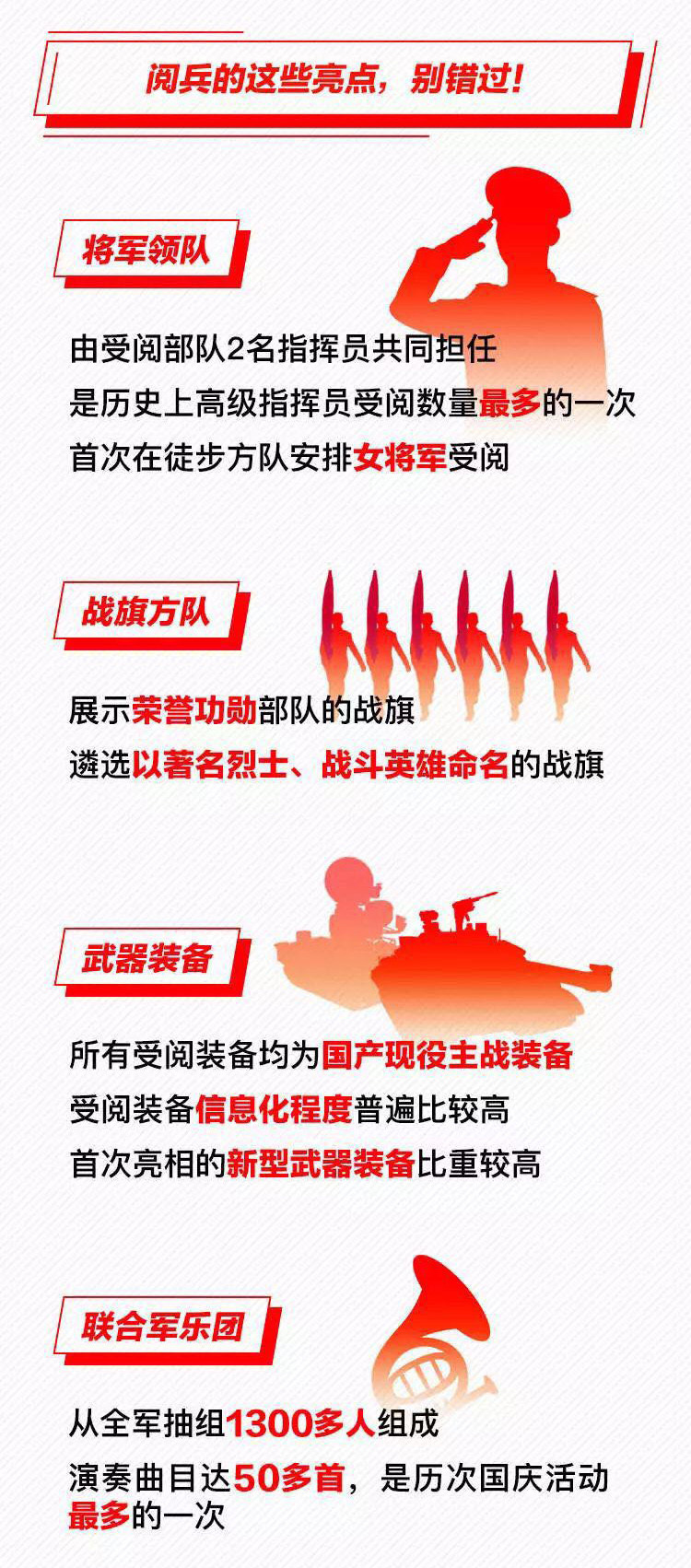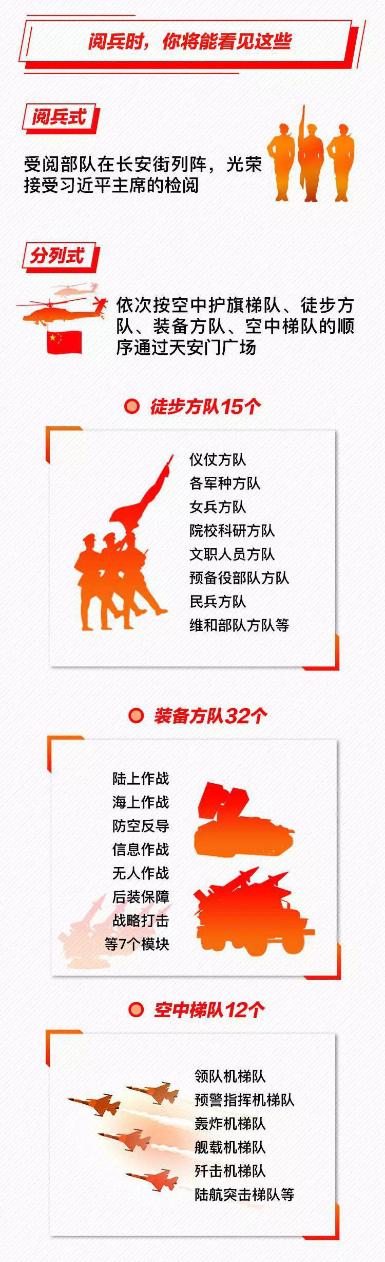 為慶祝新中國(guó)成立70周年,10月1日北京天安門(mén)廣場(chǎng)將舉行盛大閱兵式。屆時(shí),32個(gè)裝備方隊(duì)、12個(gè)空中梯隊(duì)將通過(guò)天安門(mén)廣場(chǎng),接受檢閱。此次閱兵,所有受閱裝備均為國(guó)產(chǎn)現(xiàn)役主戰(zhàn)裝備,其中包括我軍部分新型裝備,是近幾次閱兵中規(guī)模最大的一次。 強(qiáng)國(guó)必須強(qiáng)軍,強(qiáng)軍必須利器。作為我軍機(jī)械化、信息化、智能化裝備發(fā)展的骨干,全軍毀傷打擊的核心支撐和現(xiàn)代化新型陸軍體系作戰(zhàn)能力科研制造的主體,此次國(guó)慶閱兵式,兵器工業(yè)集團(tuán)研制生產(chǎn)的16型裝備將接受黨和人民的檢閱,分布在受閱裝備方隊(duì)7個(gè)模塊中的陸上作戰(zhàn)、防空反導(dǎo)、信息作戰(zhàn)、無(wú)人作戰(zhàn)、后裝保障五個(gè)模塊、32個(gè)方隊(duì)中的12個(gè)方隊(duì),集中展示了兵器工業(yè)集團(tuán)履行強(qiáng)軍首責(zé)、自主創(chuàng)新的最新成果。 10月1日大閱兵 我們準(zhǔn)備好了 |