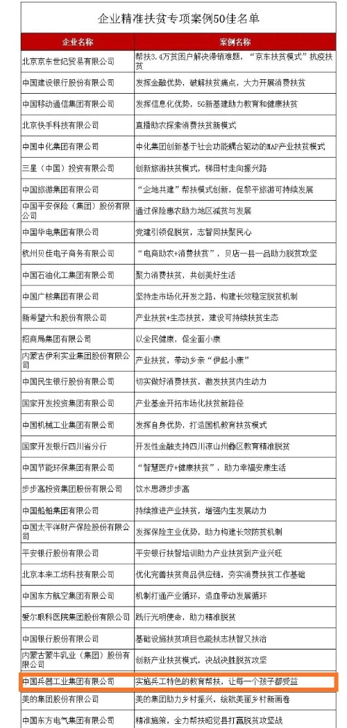 近日,國務院扶貧辦發(fā)布2020年企業(yè)精準扶貧案例獲獎名單,中國兵器工業(yè)集團有限公司《實施兵工特色的教育幫扶,讓每一個孩子都受益》案例入選2020年企業(yè)精準扶貧專項案例“50佳”。