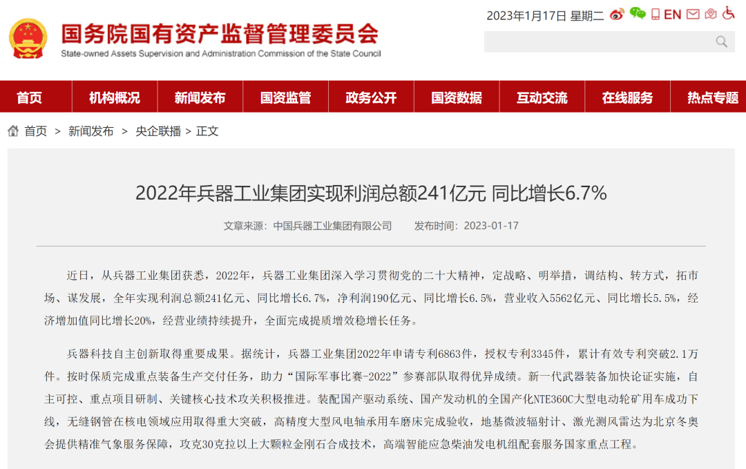 國(guó)資委網(wǎng)站:2022年兵器工業(yè)集團(tuán)實(shí)現(xiàn)利潤(rùn)總額241億元 同比增長(zhǎng)6.7%