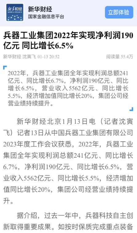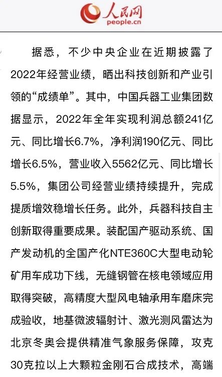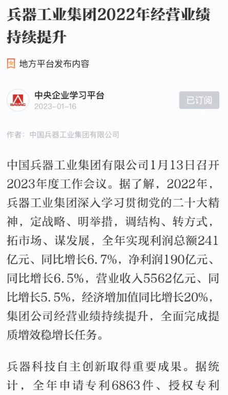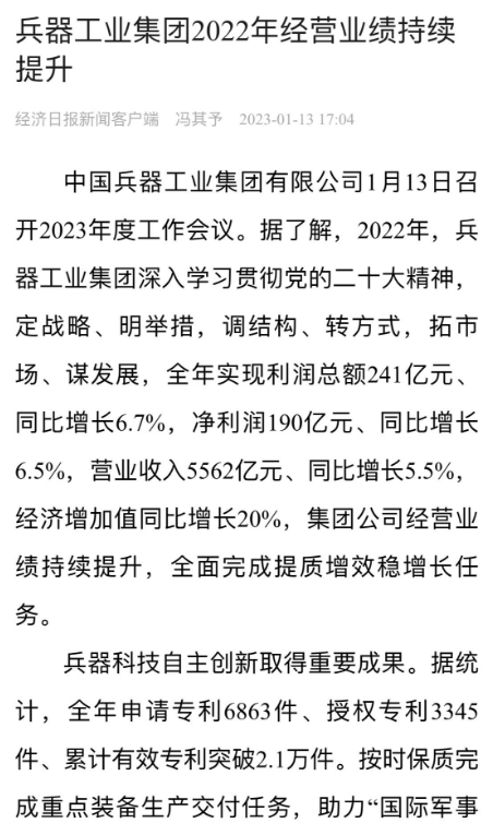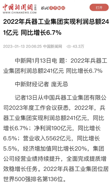 中國(guó)新聞網(wǎng):2022年兵器工業(yè)集團(tuán)實(shí)現(xiàn)利潤(rùn)總額241億元 同比增長(zhǎng)6.7%