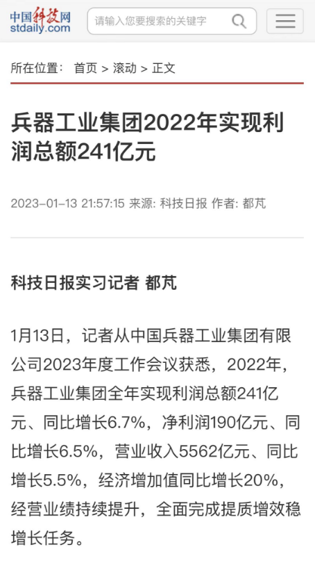 中國(guó)科技網(wǎng):兵器工業(yè)集團(tuán)2022年實(shí)現(xiàn)利潤(rùn)總額241億元