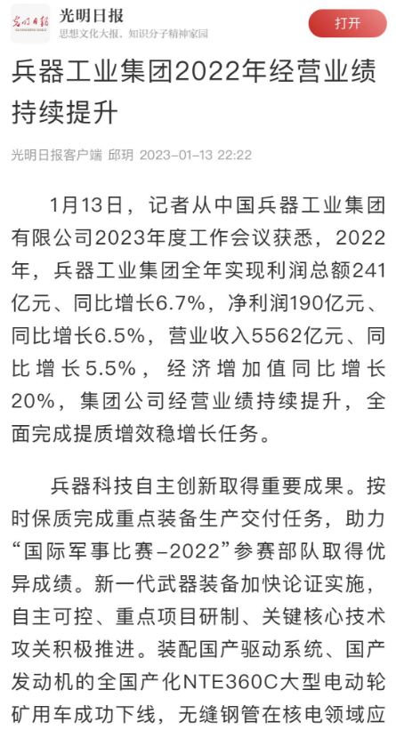 光明日?qǐng)?bào)客戶端:兵器工業(yè)集團(tuán)2022年經(jīng)營(yíng)業(yè)績(jī)持續(xù)提升