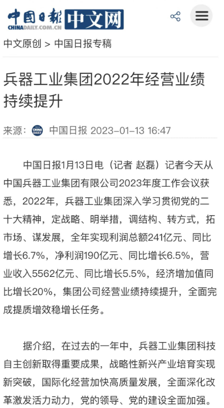 中國(guó)日?qǐng)?bào)網(wǎng):兵器工業(yè)集團(tuán)2022年經(jīng)營(yíng)業(yè)績(jī)持續(xù)提升