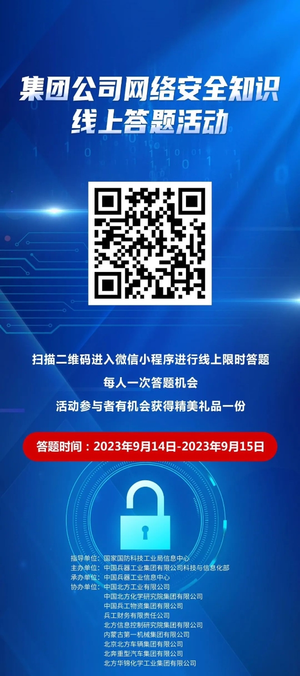 9月11日至17日,中國兵器工業(yè)集團有限公司以“數(shù)字創(chuàng)新 智御未來”為主題,圍繞集團公司“1+5”戰(zhàn)略和“雙十”規(guī)劃,組織開展集團公司網(wǎng)絡(luò)安全宣傳周系列活動。