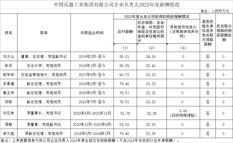 中國兵器工業(yè)集團有限公司企業(yè)負責(zé)人2023年度薪酬情況