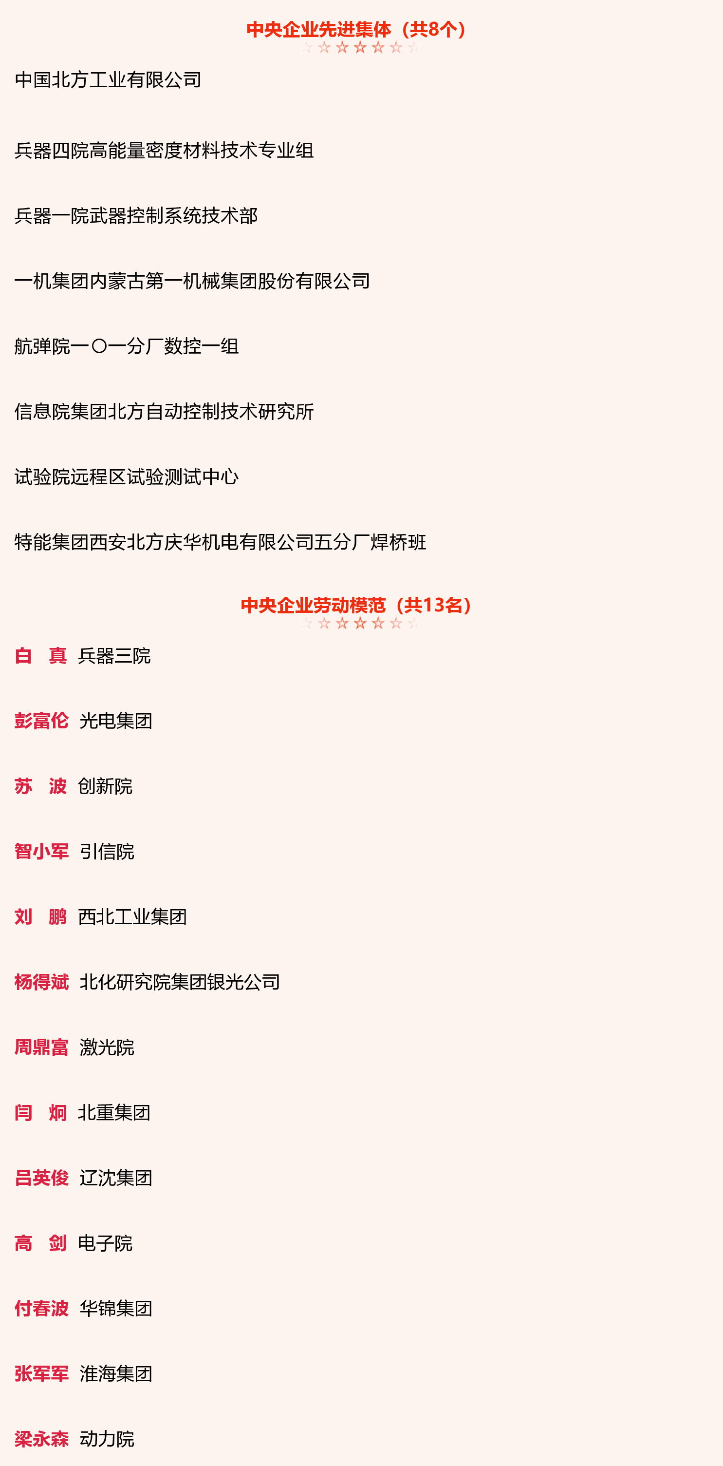 兵器工業(yè)集團(tuán)8個集體和13名個人獲中央企業(yè)先進(jìn)集體和勞動模范表彰