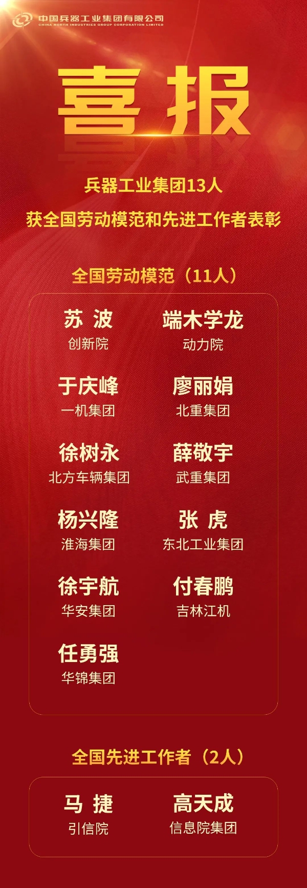 4月28日,慶祝中華全國總工會成立100周年暨全國勞動模范和先進工作者表彰大會在北京舉行,大會表彰了1670名全國勞動模范和756名全國先進工作者。中國兵器工業(yè)集團有限公司13人榮獲表彰,其中全國勞動模范11人、全國先進工作者2人。